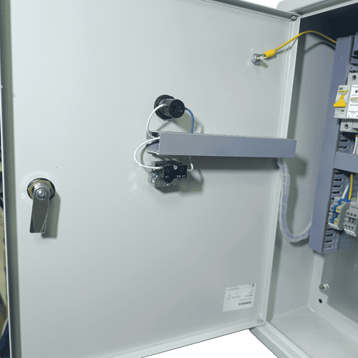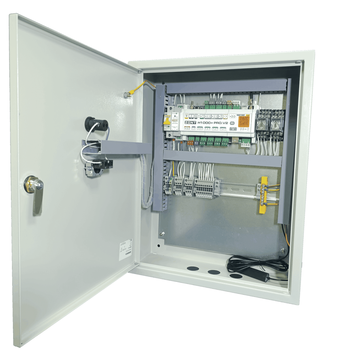 Готовый шкаф автоматики Zont для котельной в металлическом корпусе  Внутреннее устройство шкафа управления котельной Zont: программируемый контроллер, электромагнитные пускатели, клеммные ряды и защитная автоматика Шкаф управления котельной на базе Zont с установленным блоком бесперебойного питания и многоступенчатой системой защиты автоматики  Установленный на стену шкаф автоматики Zont с открытой крышкой